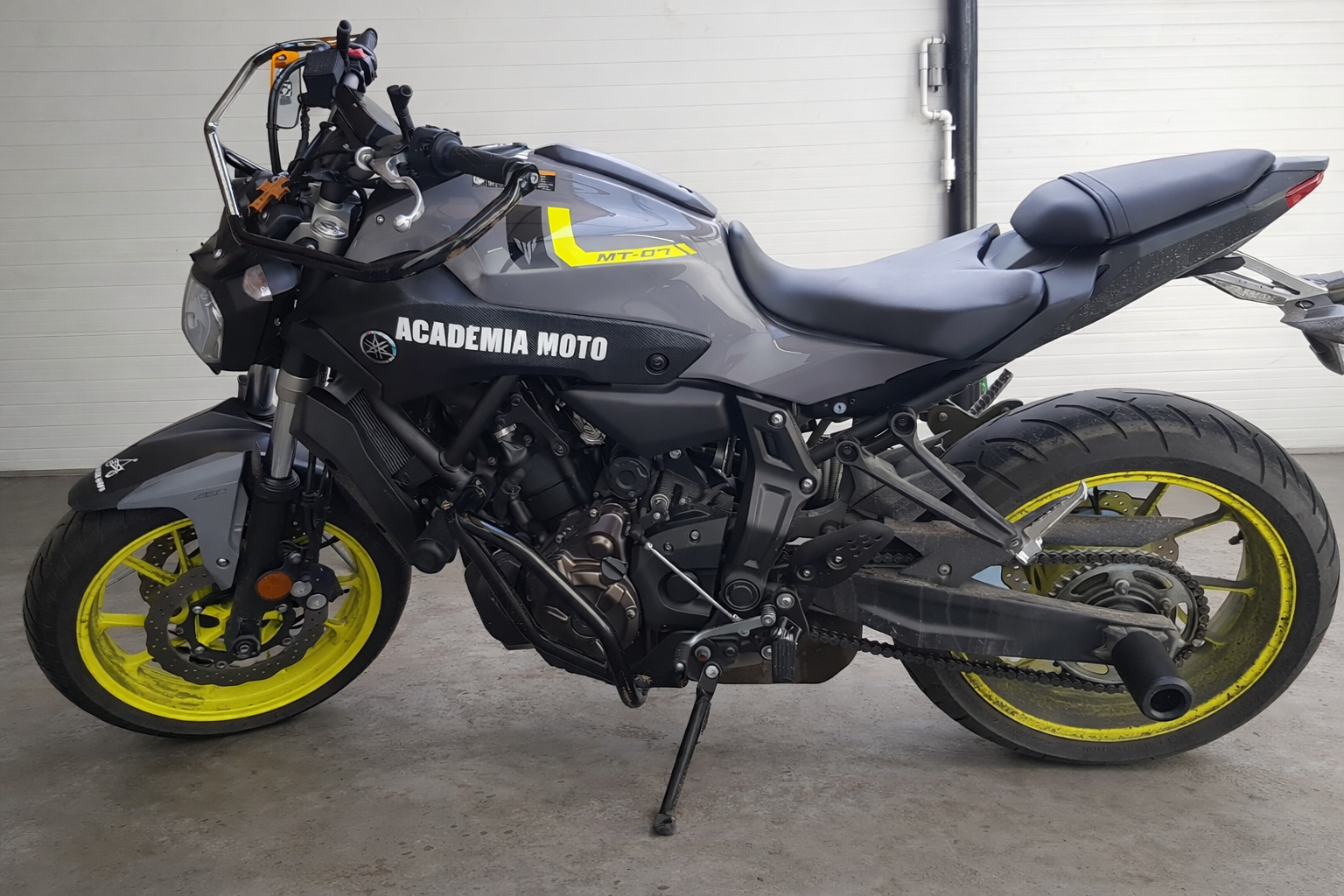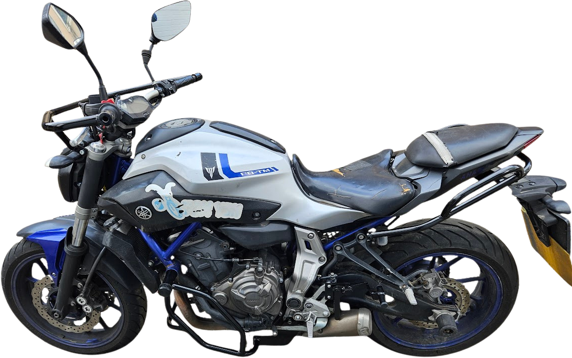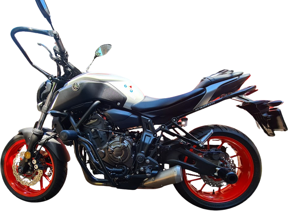 MT-07 cu CP2-ul său de 689cc a devenit una dintre cele mai iubite motociclete ale ultimilor ani — echilibrul perfect între putere, greutate și costuri. Crash bars-urile respectă linia curată a cadrului, cu protecție frontală și rack spate discret integrat.